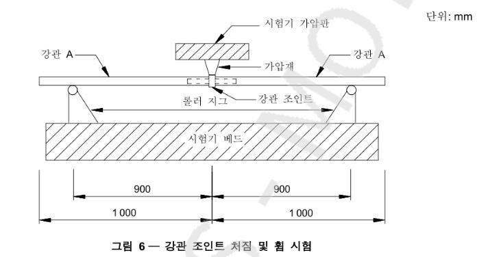 그림 6과 같이 단선방지기능이 활성화된 강관이음부를 시험기에 압력재와 2개의 강관A로 부착하고 압력재를 관의 중앙에 누르고 하중을 가하여 최대치를 측정한다. 짐의 가치.
