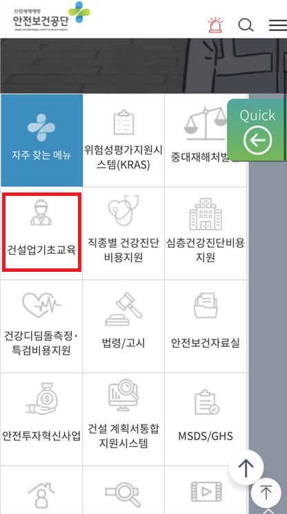 위 자주찾는 메뉴 > “건설업 기초교육” 입력 후 본인인증하다.