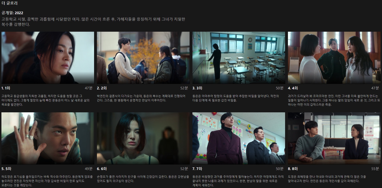 더 글로리는 한국의 유명 여배우 ‘송혜교’와 한국의 인기 작가 ‘김은숙’의 콜라보레이션으로 방영 전부터 드라마에 대한 관심이 높았다.