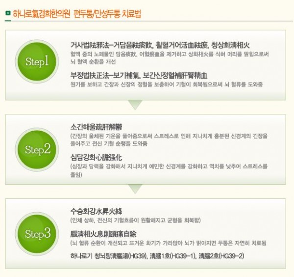 증상이 심한 환자는 한방 온열요법인 아로마, 소적 치료 등을 병행하기도 합니다. 굳어진 위와 장 근육을 풀어줄 수 있는 아로마 오일 또는 해독 기능의 한약 성분을 사용하여 복부를 20분간 마사지합니다. 위장 전체를 따뜻하게 해서 소화기계 기능을 활성화시키고 대사 기능도 촉진합니다. 이 외에도 약침치료, 간정화치료, 임독맥 온열도포법 등 다양한 치료가 있으며, 1:1 환자맞춤형 치료를 진행합니다. 아래 이미지를 클릭하시면 만성두통 한방치료에 대한 자세한 내용을 보실 수 있습니다.