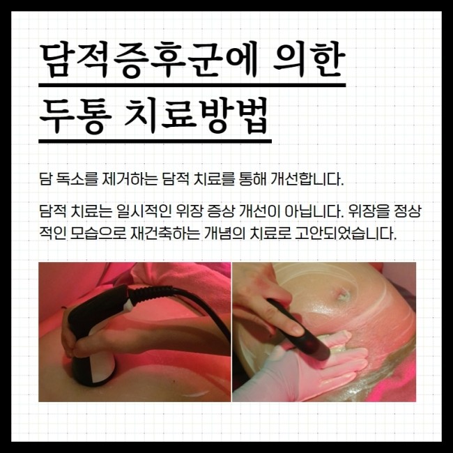 두통의 원인은 주로 스트레스를 과도하게 받거나 피로 누적, 뇌신경 긴장&수축 등의 변화, 갑작스러운 환경 변화 등을 들 수 있습니다. 이런 두통을 줄이기 위해 일반적으로 진통제를 먹지만 두통이 만성화되면 약물치료에도 일시적인 증상완화만 있을 뿐 근본적인 치료가 어려울 수 있습니다. 약을 먹어도 증상이 지속되거나 정밀검사를 해도 별다른 이상이 없는 경우 두통, 어지러움의 원인을 한의학에서는 ‘담적증후군’으로 보고 있습니다. ‘담적’은 음식물이 제대로 소화되지 않아 부패하면서 발생한 담독소가 위장 점막은 물론 위장 외벽에 쌓여 굳어지게 하는 것을 말합니다.
