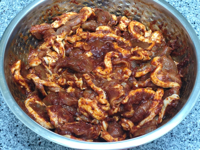 생오리 주물럭 레시피입니다. 위의 요리에서 남은 육수와 고기를 사용했습니다.
