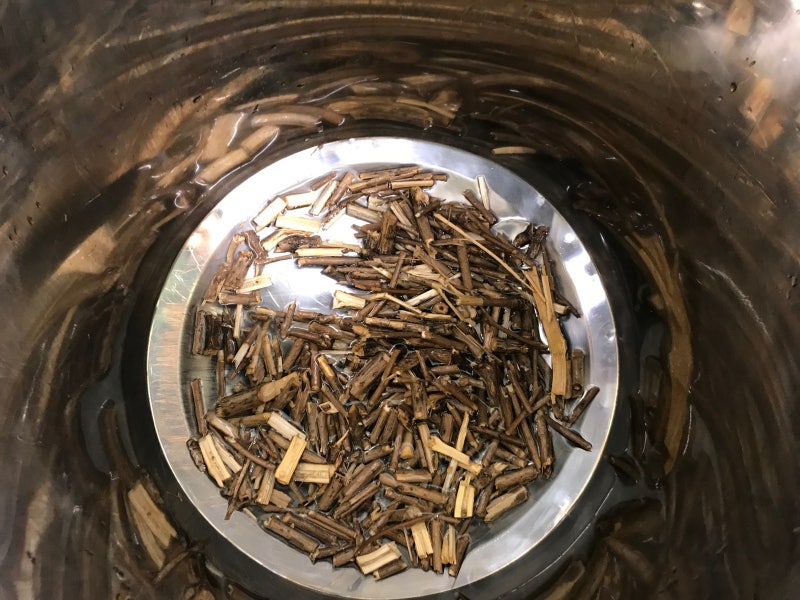 오이 껍질을 씻어 냄비에 넣고 감초를 조금 넣었습니다.